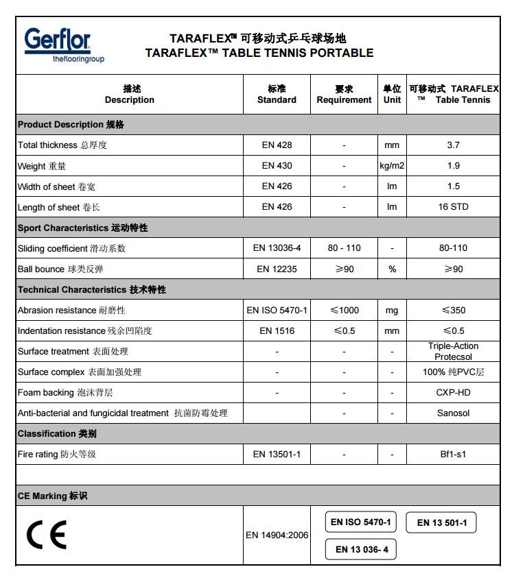 Taraflex?乒乓球運動地板的紅色為國際乒聯(lián)指定色。 Taraflex? 乒乓球運動地板是多層 PVC 地面材料,表層為致密輪壓的乙烯基,底層密閉式細胞泡 沫背層,以無紡玻璃纖維網(wǎng)格作為加強材料。 該產(chǎn)品經(jīng)過 Triple-Action Protecsol 處理(防污,防灼熱擦傷,防阻滯且防滑),同時,該產(chǎn)品每層都 經(jīng)過 Sanosol 處理,具有抗菌防霉的優(yōu)點。 乒乓球 7.0 多層輪壓型 7mm 左右厚度的 PVC 地面材料,表層經(jīng)過 D-Max 加強處理,以無紡玻璃纖維網(wǎng)格作為加 強材料,底層為密閉式細胞雙層泡沫背層 XCP(細胞壁超強化處理)。 該地板符合室內(nèi)運動地板的標準 NFP 90 203 和標準 NF EN 14-904。 該產(chǎn)品經(jīng)過處理(防污,防灼熱擦傷,防阻滯且防 滑),同時在過程中,產(chǎn)品每層都進行了 Sanosol 抗菌防霉處理。