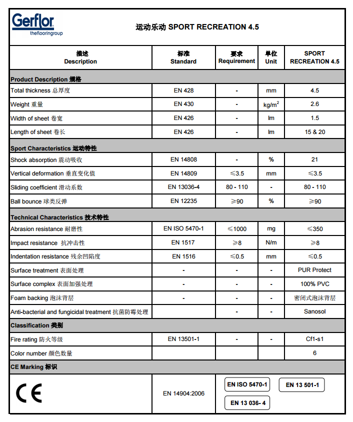 活動區(qū)、學校綜合體育館等.運動樂動 4.5 產(chǎn)品經(jīng)過聚氨酯紫外線光固化(PUR Protect)處理,具有優(yōu)異的耐用性能。