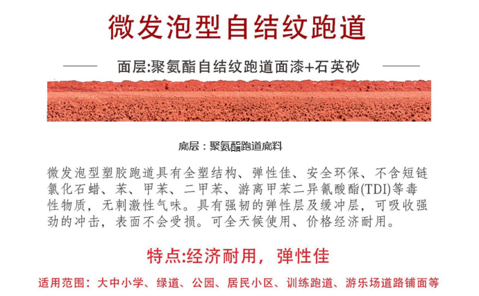 由于產(chǎn)品表面采用顆粒與聚氨脂膠粘劑混合后噴涂,不會產(chǎn)生脫離現(xiàn)象。表面耐磨性強。能滿足學(xué)*長時間,高頻率教學(xué)使用,而且價格低廉,所以非常適合中小*校鋪設(shè)。